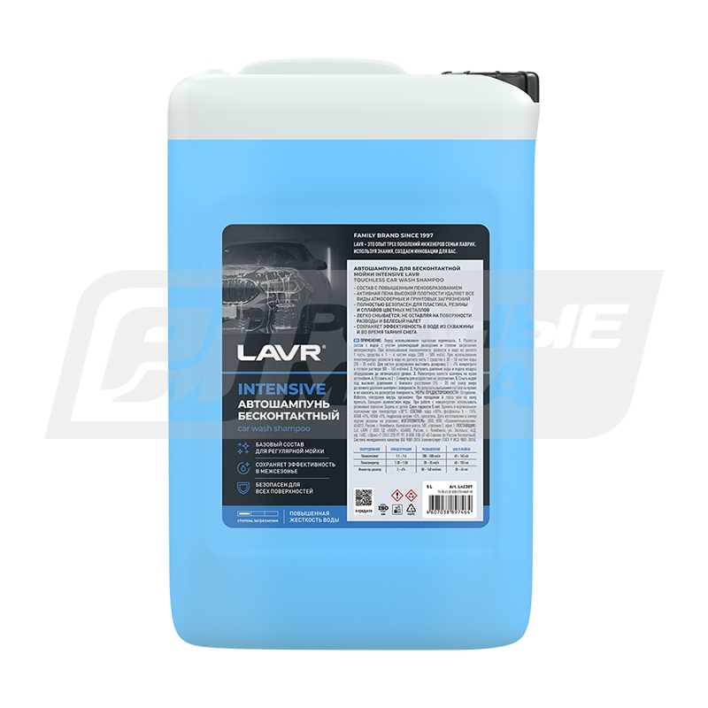 Автошампунь для бесконтактной мойки Intensive LAVR – концентрированное средство для очистки внешних поверхностей автомобилей, мотоциклов, велосипедов и т.д. Состав с высоким пенообразованием размягчает и отслаивает частицы грязи, которые затем легко смываются водой. Безопасен для лакокрасочного и других покрытий.